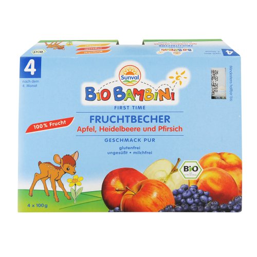 Sunval Fruchtbecher Apfel,Heidelbeere und Pfirsich 4 x 100 g, 4er Pack (4 x 400 g) - Bio